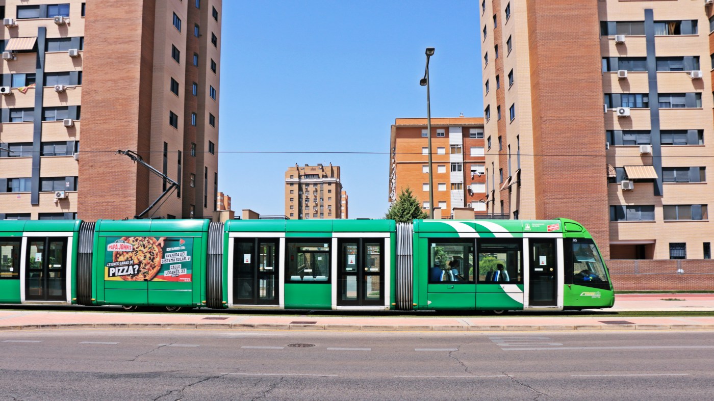Imagen de un tranvía de Parla circulando por las calles de Parla Este. Fotografía del autor.