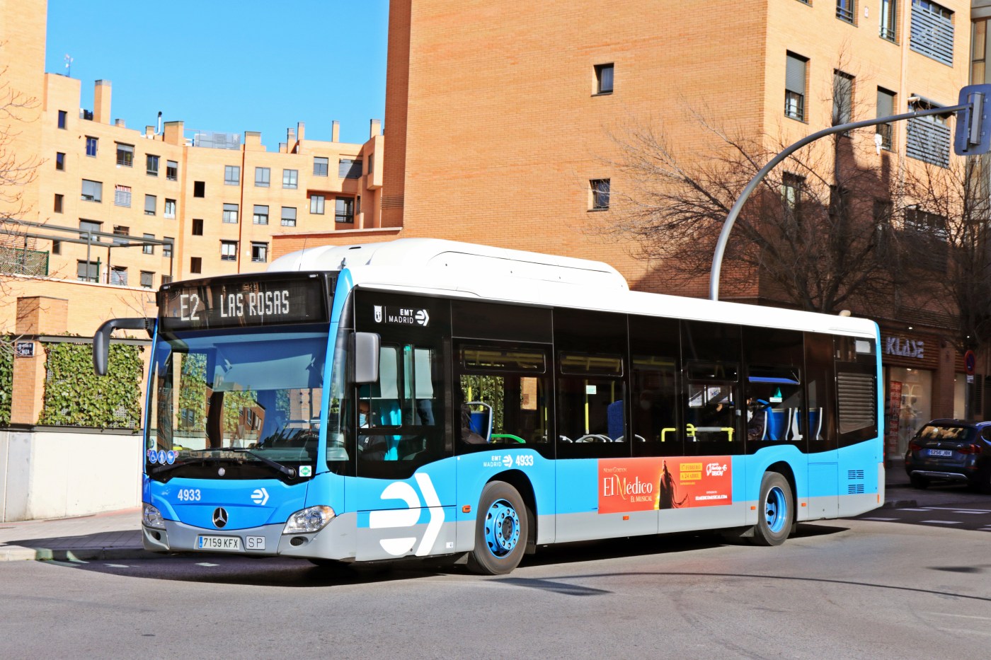 Imagen de un autobús en la línea E2 circulando en Las Rosas. Fotografía del autor.