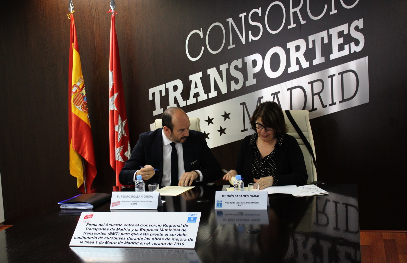 En la mañana de hoy, ha tenido lugar en la sede del Consorcio Regional de Transportes la firma entre el consejero de Transportes, Vivienda e Infraestructuras de la Comunidad, Pedro Rollán; y la delegada de Movilidad y Medio Ambiente del Ayuntamiento de Madrid, Inés Sabanés; que establece la concesión del Servicio Especial de autobuses de la línea 1 del Metro de Madrid a la Empresa Municipal de Transportes de Madrid.