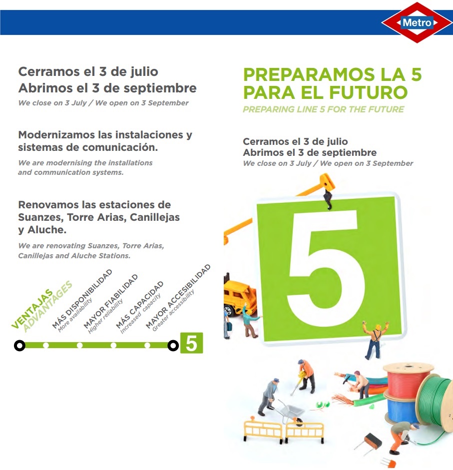 El próximo día 3 de julio, se dará comienzo a las obras de la línea 5 del Metro de Madrid, entre las estaciones de Alameda de Osuna – Casa de Campo; ocasionando un cierre completo de la línea. Ante tal cierre, se ha dispuesto varios servicios especiales de autobuses, los cuales tienen una previsión de duración hasta el día 3 de septiembre.
