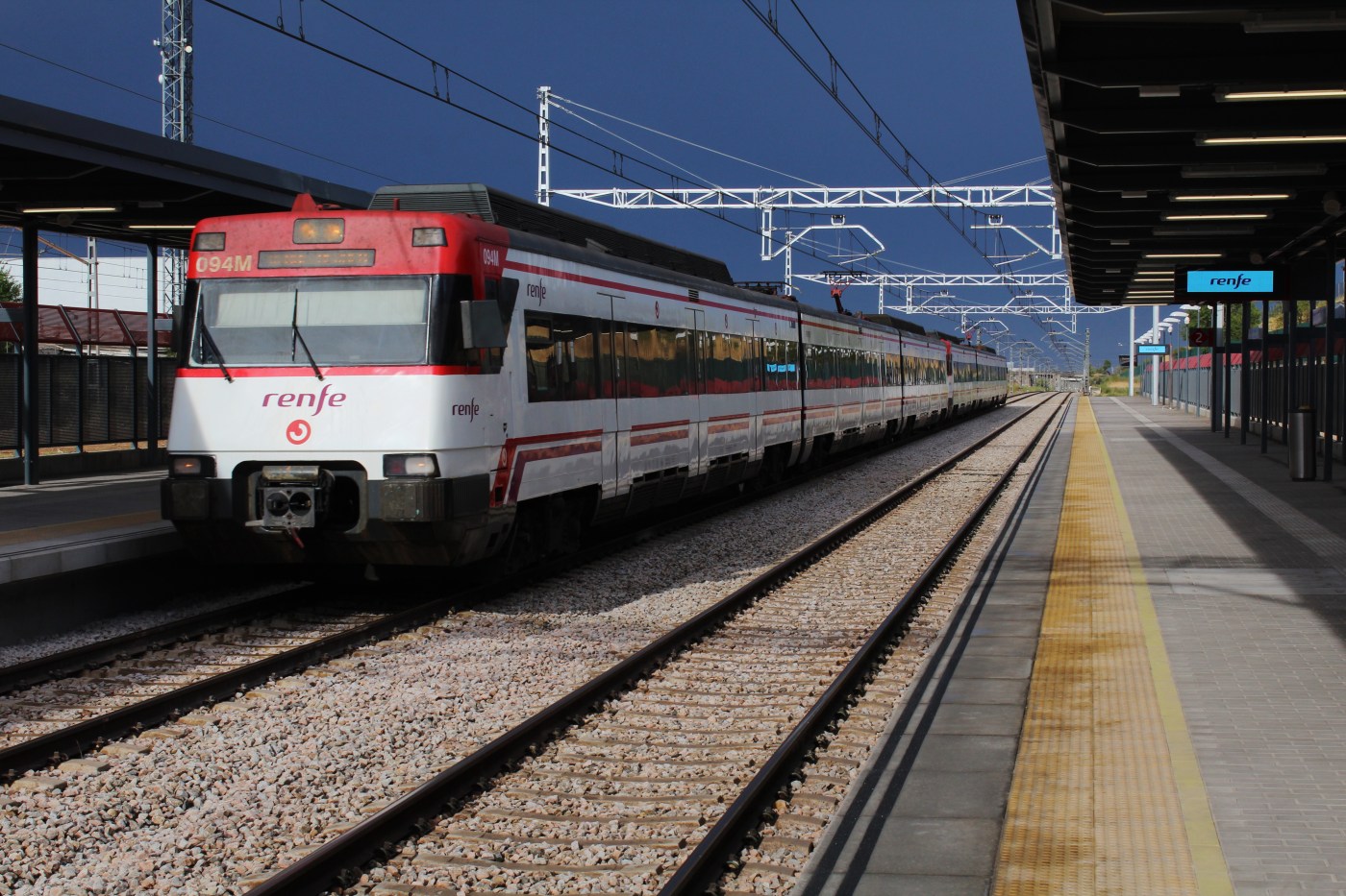 Imagen de un tren de Cercanías al paso de la estación de Soto del Henares. Fotografía del autor.