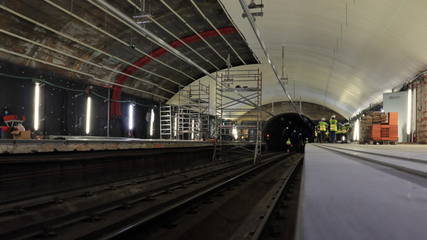 El estado de los andenes de la estación se encontraba con gran parte de los elementos eliminados para permitir la instalación de los paneles de acero vitrificado, los cuales serán de color amarillo claro, y parte del revestimiento del techo. Estos últimos trabajos han sido posibles con la instalación de la catenaria de tipo rígida, elemento central en la mejora de los sistemas de electrificación de la línea férrea. En el momento de nuestra visita, se encontraban varios operarios colocando los soportes de la catenaria rígida, la cual va tomando forma en toda la infraestructura.